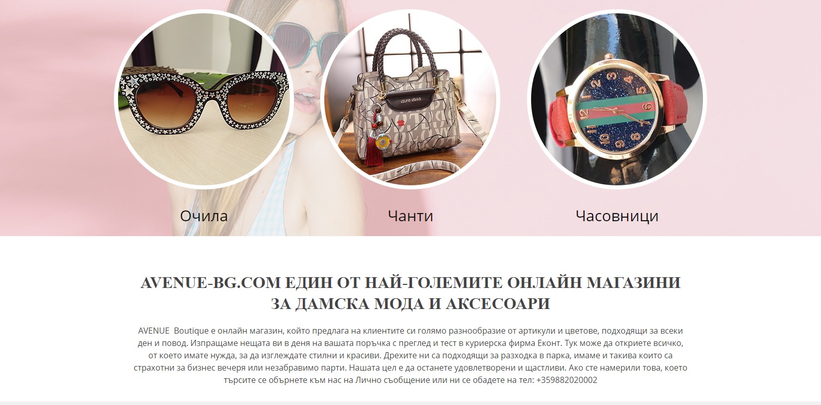 AVENUE Boutique е онлайн магазин, който предлага на клиентите си голямо разнообразие от артикули и цветове, подходящи за всеки ден и повод. Изпращаме нещата ви в деня на вашата поръчка с преглед и тест в куриерска фирма Еконт. Тук може да откриете всичко, от което имате нужда, за да изглеждате стилни и красиви. Дрехите ни са подходящи за разходка в парка, имаме и такива които са страхотни за бизнес вечеря или незабравимо парти. Нашата цел е да останете удовлетворени и щастливи.