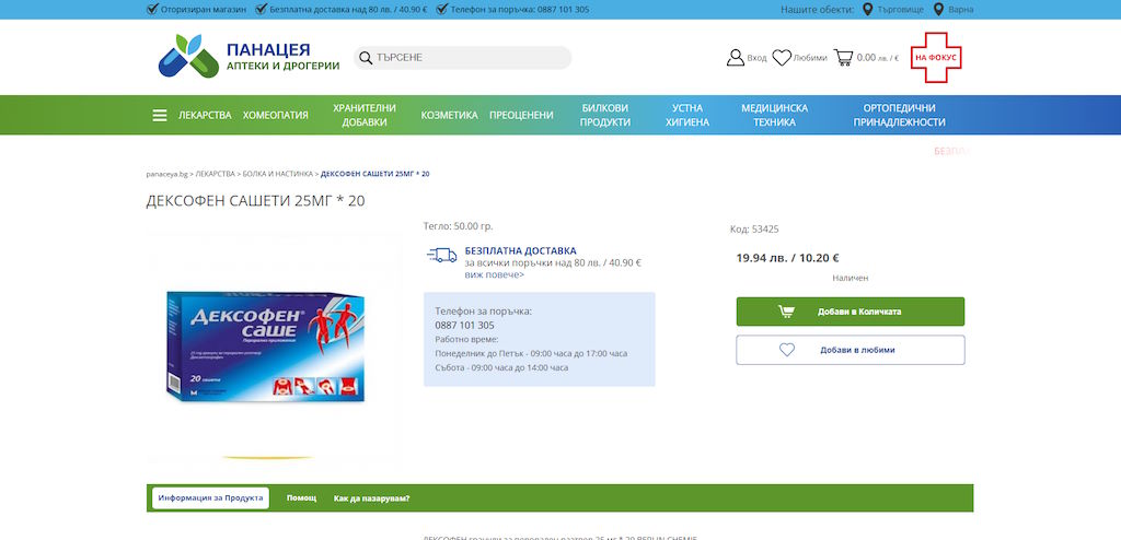 Онлайн аптека ПАНАЦЕЯ предлага пълна гама лекарства на водещи български и световни производители, отпускани по рецепта и без рецепта.